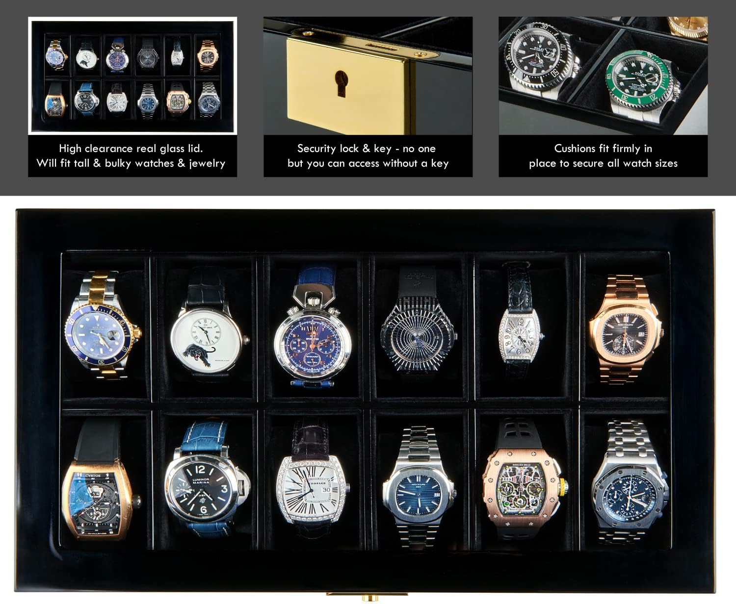 Luxury 12-Slot Watch Box Organizer – Lockable Glass Display Case with Velvet Lining