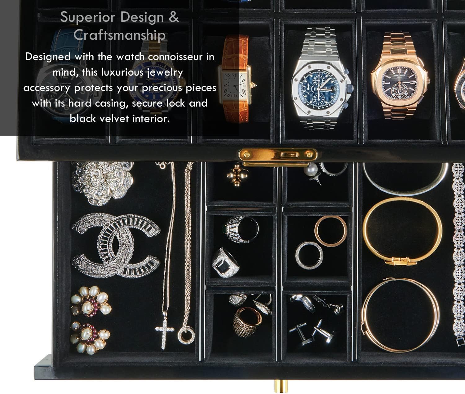 Each velvet-lined slot securely holds both small and large watches, while the lower drawer stores bracelets, cufflinks, and accessories. The clear glass lid protects from dust while allowing easy display of your favorite timepieces.
